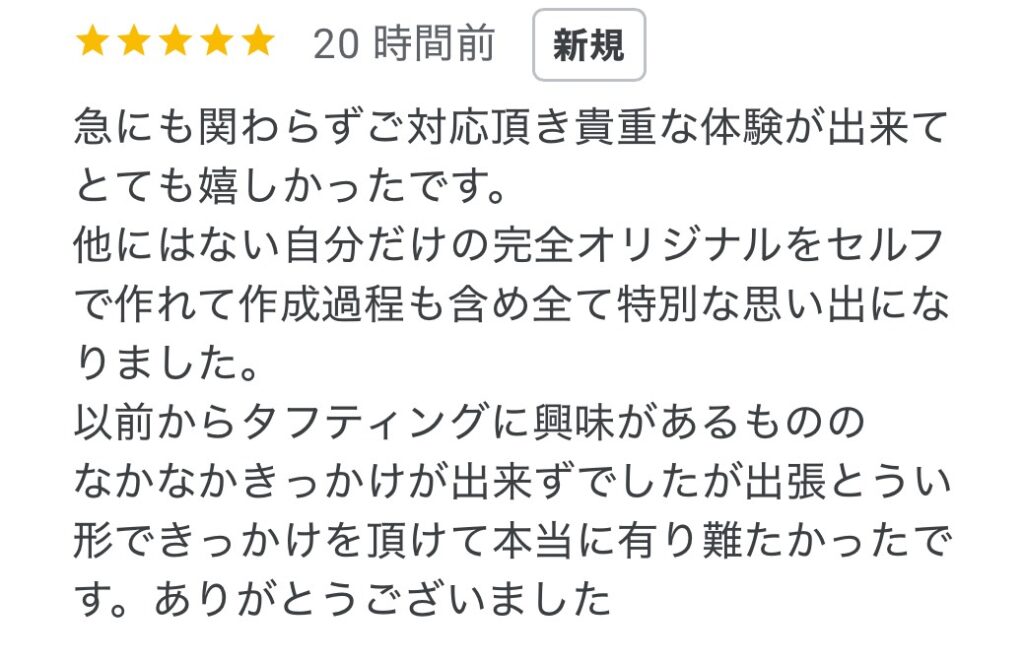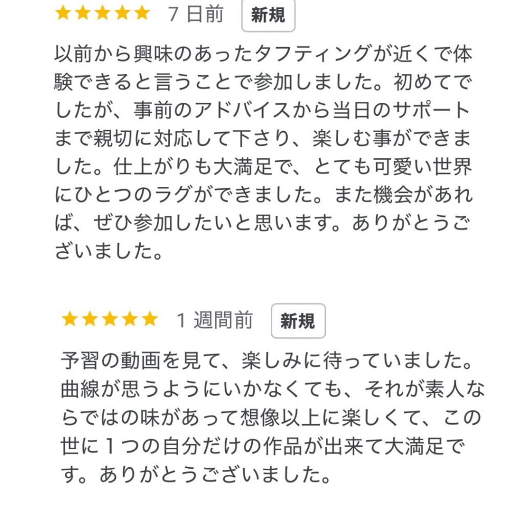 見ているのと実際やるのとではやはり違いましたが、タフティングガンの扱い方やコツがわかってとても楽しかったです。 次にまた作ったら今回よりも上手に出来そうな気がするのでまた是非体験したいです。 次回の新潟開催があったらまた参加したいと思います。楽しみにしています!